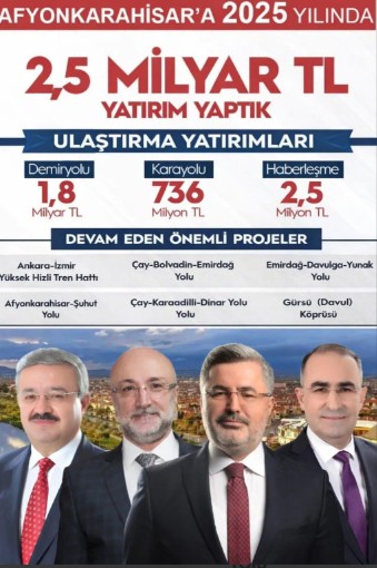 AK Parti Afyonkarahisar İl Başkanlığı, 2025 yılında Afyon’a 2,5 milyar TL değerinde ulaştırma yatırımı kazandırıldığını açıkladı. Parti, demiryolu, karayolu ve haberleşme alanlarındaki yatırımların yanı sıra birçok önemli yol ve köprü projesinin de devam ettiğini duyurdu.