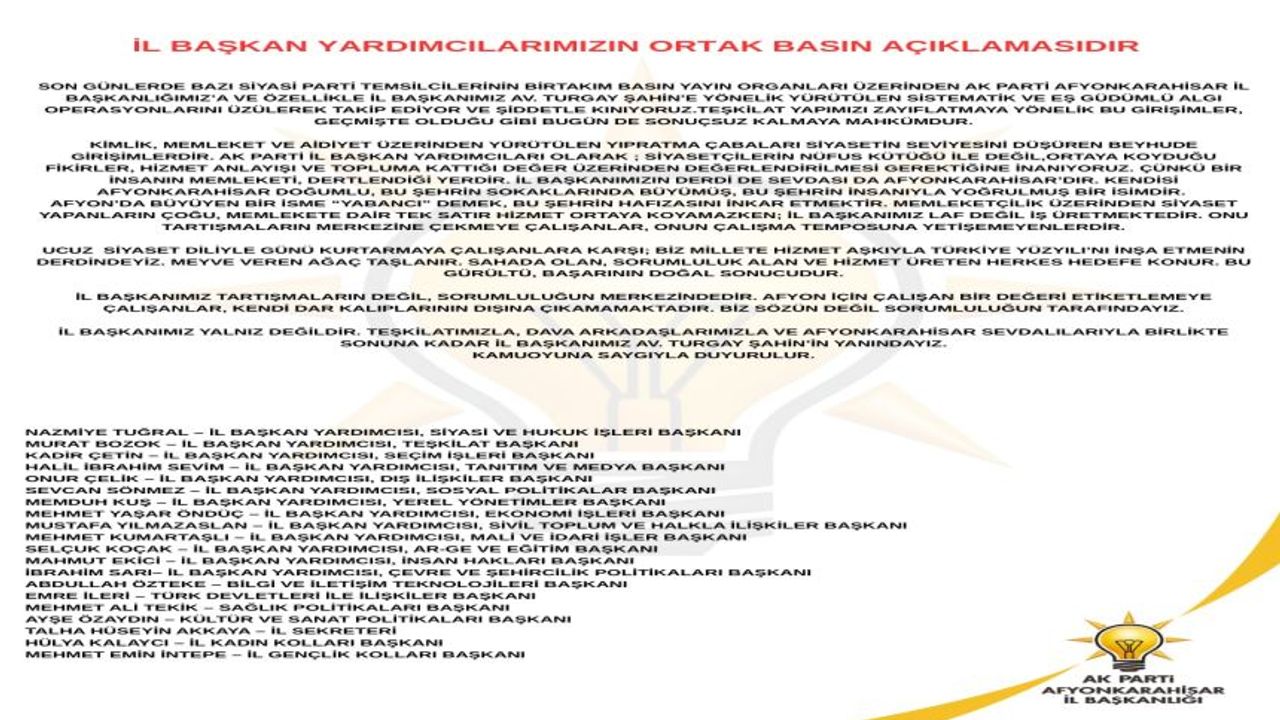 Son günlerde bazı siyasi parti temsilcilerinin birtakım basın yayın organları üzerinden AK Parti Afyonkarahisar İl Başkanlığımız’a ve özellikle İl Başkanımız Av. Turgay Şahin’e yönelik yürütülen sistematik ve eş güdümlü algı operasyonlarını üzülerek takip ediyor ve şiddetle kınıyoruz.Teşkilat yapımızı zayıflatmaya yönelik bu girişimler, geçmişte olduğu gibi bugün de sonuçsuz kalmaya mahkümdur.