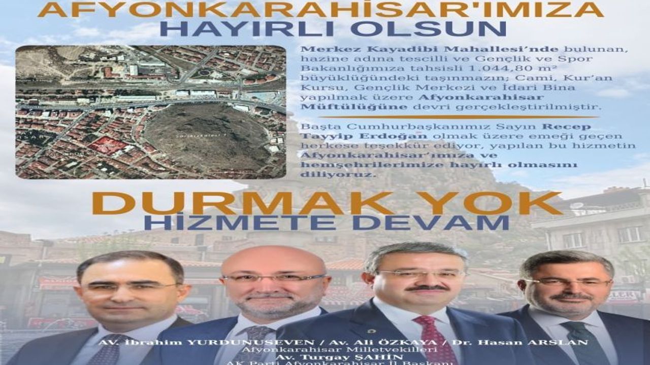 Afyonkarahisar Müftülüğüne devri yapılan taşınmaz üzerinde cami, Kur’an kursu, gençlik merkezi ve idari bina inşa edilmesi planlanıyor. Söz konusu yatırımın özellikle gençlerin eğitimine, manevi gelişimine ve bölgedeki sosyal hayata önemli katkılar sunması hedefleniyor.