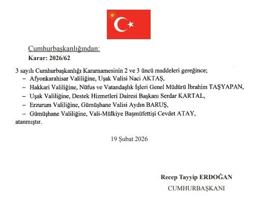 Resmi Gazete’nin bugünkü sayısında yayımlanan Cumhurbaşkanlığı Kararnamesine göre; Uşak Valisi Dr.Naci Aktaş Afyonkarahisar Valiliğine atandı.